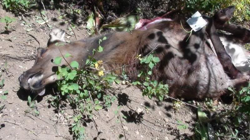 So after things quieted down, I went over to the place the elk was standing and there was a lot of blood so I began trailing the blood. After about a quarter of a mile I jumped the elk from a bed and it was clearly the calf but I have no shot. This goes on for about another 200 yards and I jump it again and still no shot but it is weak from loss of blood and does not go far before bedding again. About the third time it is too weak to run anymore I can move laterally to get enough of an angle to get another arrow into it. In the end I used my knife to finish it.